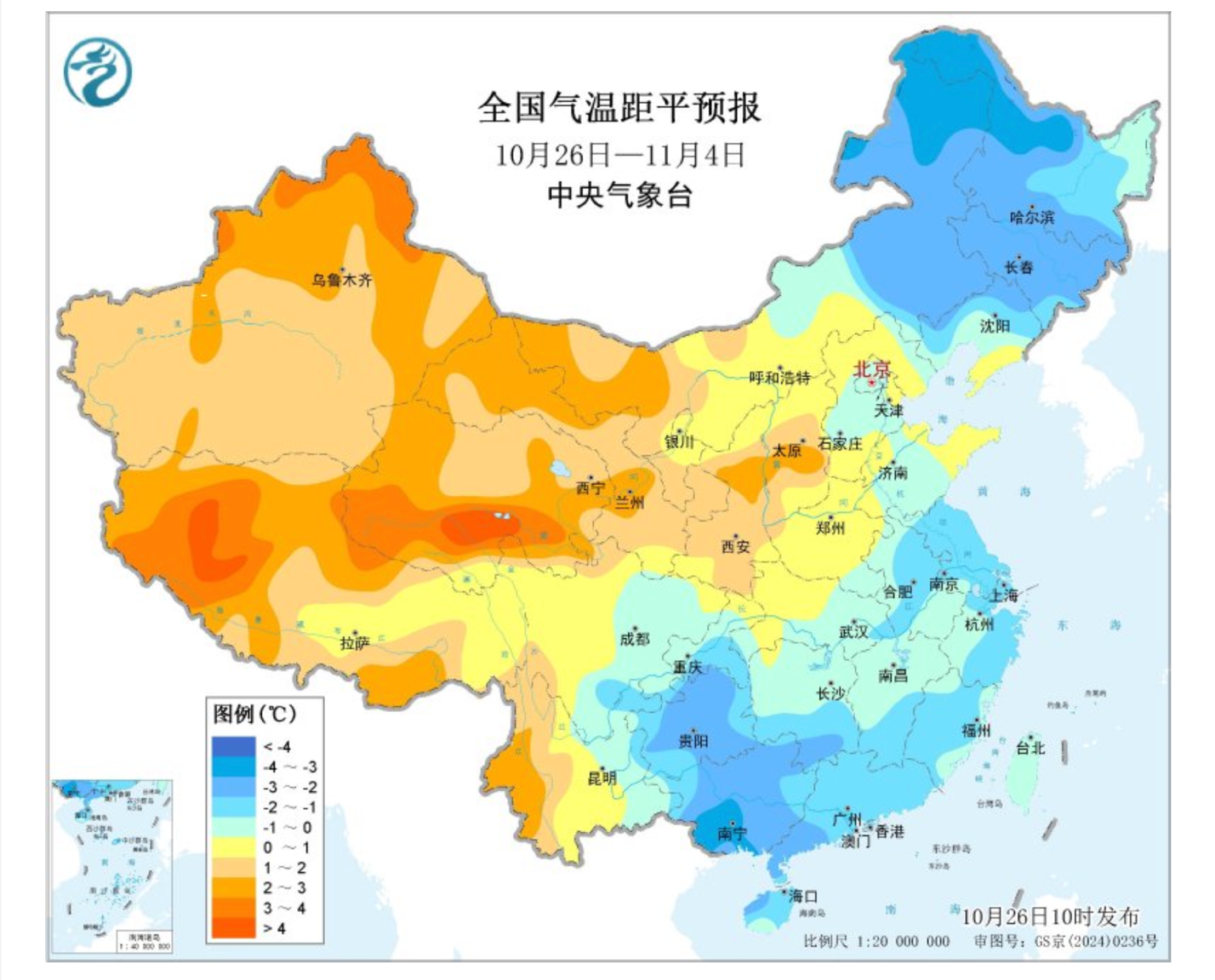 根据中国天气网10月26日签发的中期天气预报,10月26日-11月4日,预计华南江南中东部气温转为偏低,青藏高原东部有持续雨雪天气。内蒙古东北部、东北地区大部、江淮、江南东部和南部、华南及贵州等地平均气温较常年同期偏低1~3℃,新疆、西北地区、青藏高原大部及云南西部等地气温偏高1~3℃。