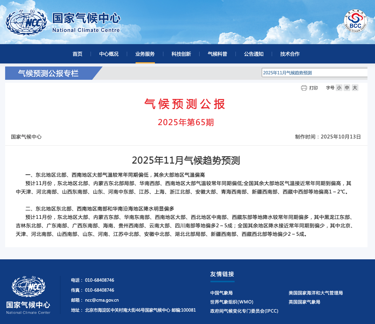 根据国家气候中心10月13日发布的2025年第65期《气候预测公报》,预计11月,东北地区北部、西南地区大部气温较常年同期偏低,其余大部地区气温偏高1~2℃;东北地区东北部、西南地区南部和华南沿海地区降水明显偏多2-5成。