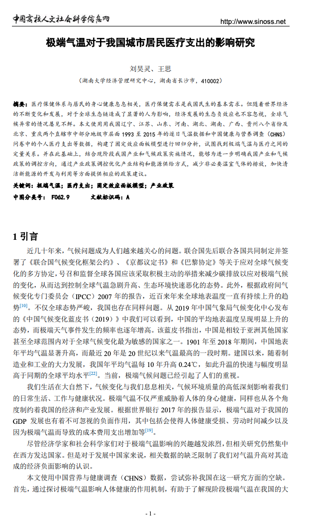 湖南大学经济管理研究中心的两位学者刘昊灵、王思于2021年在中国高校人文社会科学信息网上发表论文,研究极端气温对我国城市居民医疗支出的影响。