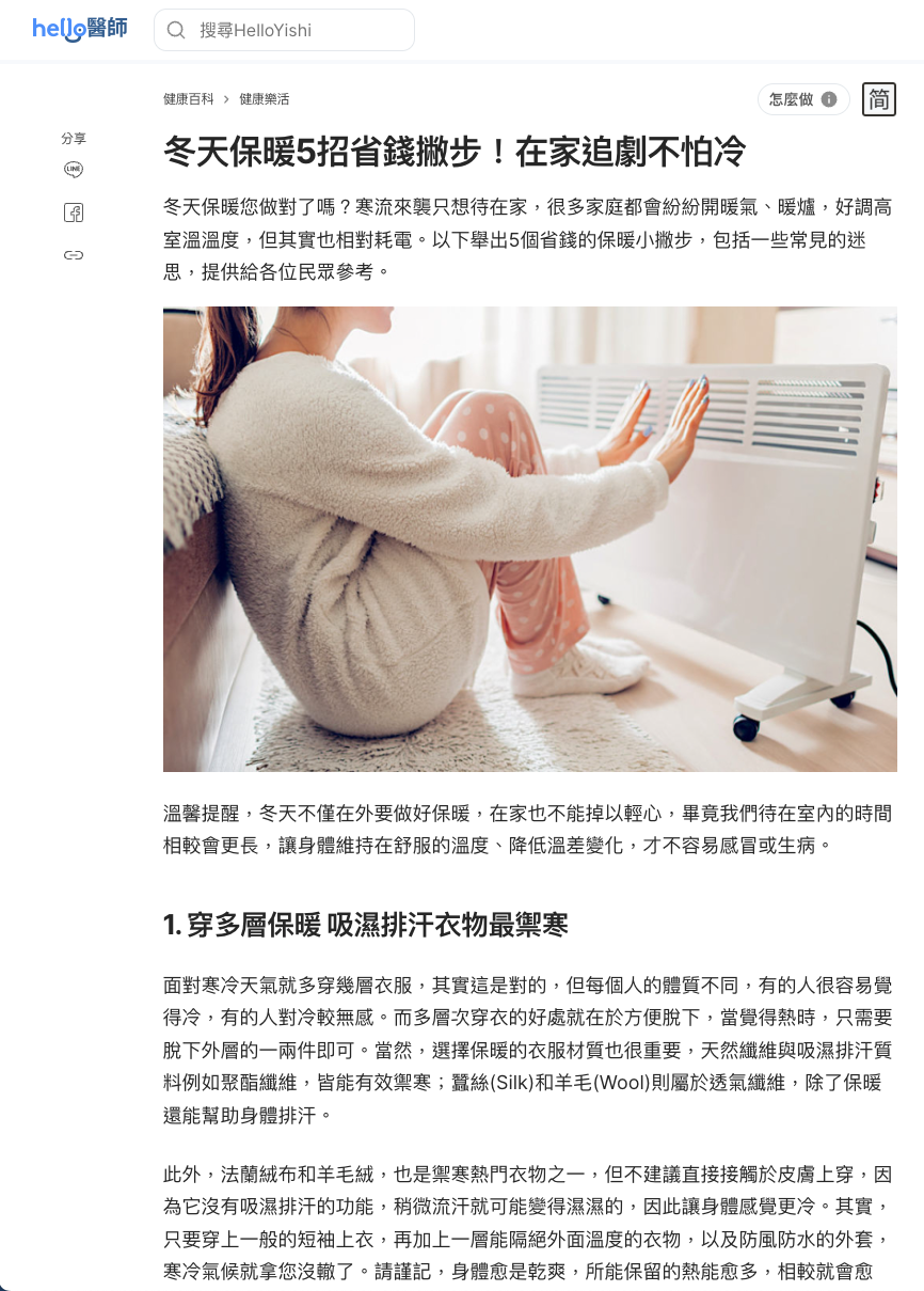 中国台湾的医疗健康资讯网站hello医师2024年11月发布了一篇文章,教大众冬天省钱又保暖的5个妙招: