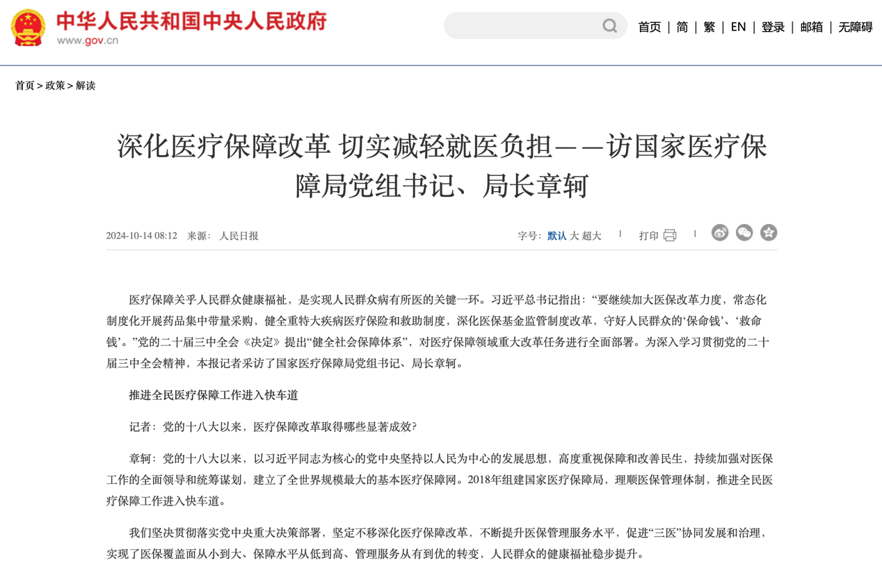 2024年10月14日,中国政府网转载了《人民日报》对国家医保局党组书记、局长章轲的采访。据章轲介绍: