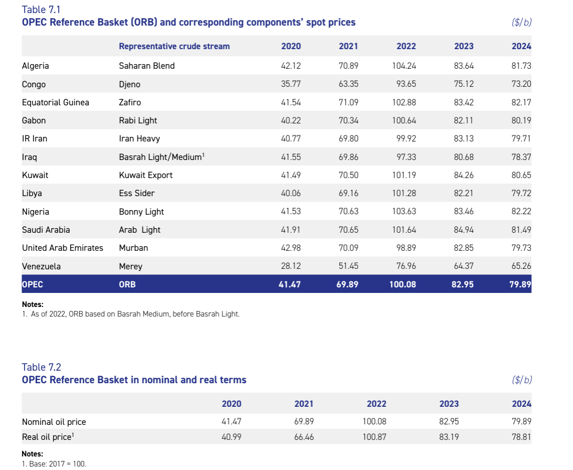 在价格方面,委内瑞拉的重质高硫原油代表油种 Merey 被纳入 OPEC 参考油价篮子(ORB)。由于油质较重、炼化成本较高,Merey 价格长期低于油篮平均水平。2024年,Merey 现货均价约为65美元/桶,而 ORB 均价接近80美元/桶,价差约15美元/桶。这一结构性价格劣势持续多年,反映出其原油在国际市场上的竞争压力。