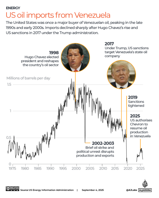 半岛电视台2025年9月4日报道指出,美国自2017年起对委内瑞拉实施一系列经济制裁。美国曾是委内瑞拉石油的重要买家,1990年代末和2000年代初每天进口量超过150万桶。随着查韦斯在1998年上台以及2002-2003年的短期罢工和政治动荡,产量和出口出现波动。2017年制裁实施后,美国进口量急剧下降,2019年收紧制裁后几乎降至零。在经历了三年多的石油运输中断后,2022 年 11 月,美国财政部向雪佛龙(美国跨国能源公司)发放了短期许可证,允许其从委内瑞拉恢复有限规模的石油生产和出口。