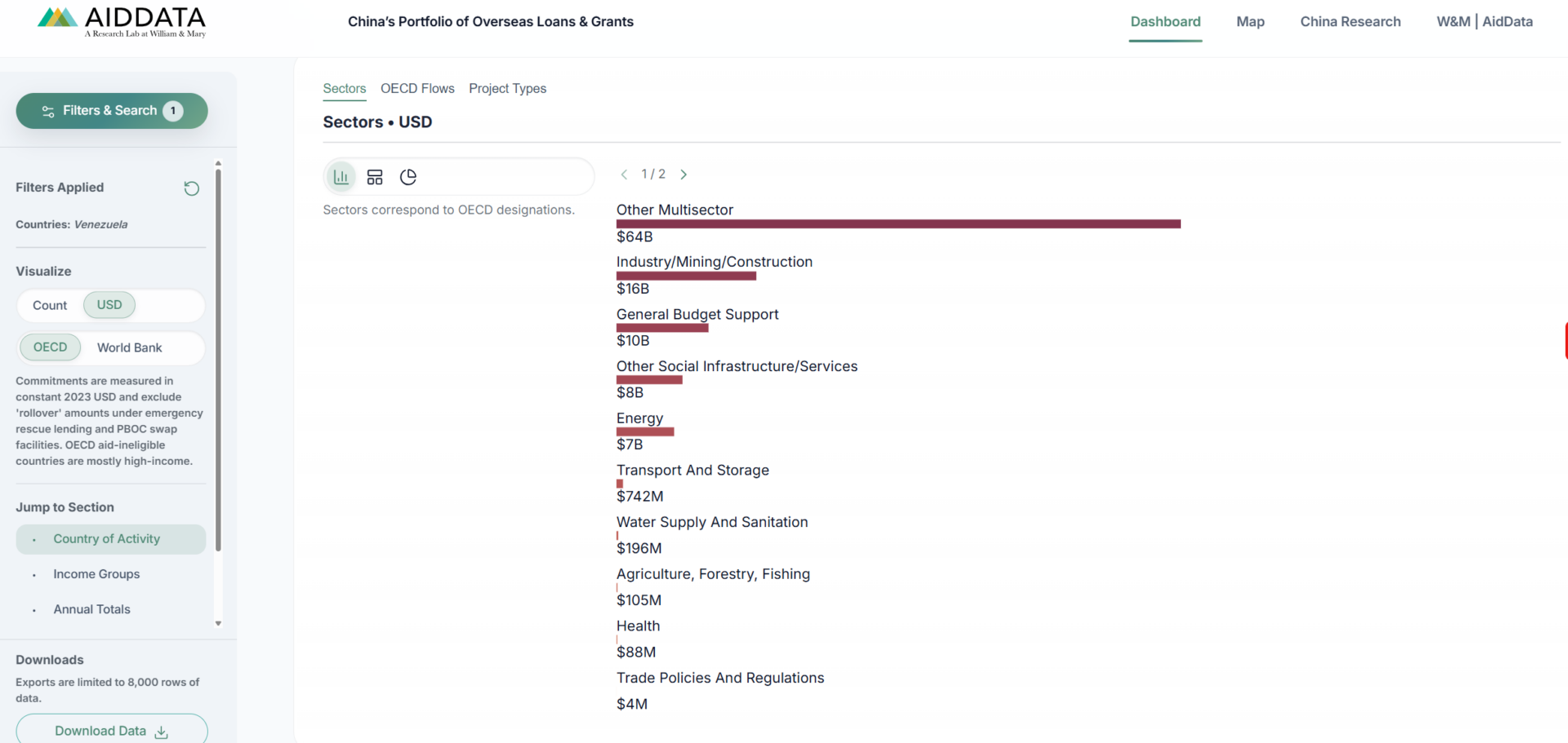 AIDDATA 数据显示,中国对委内瑞拉累计承诺贷款与援助项目共177个,总金额约1057亿美元。