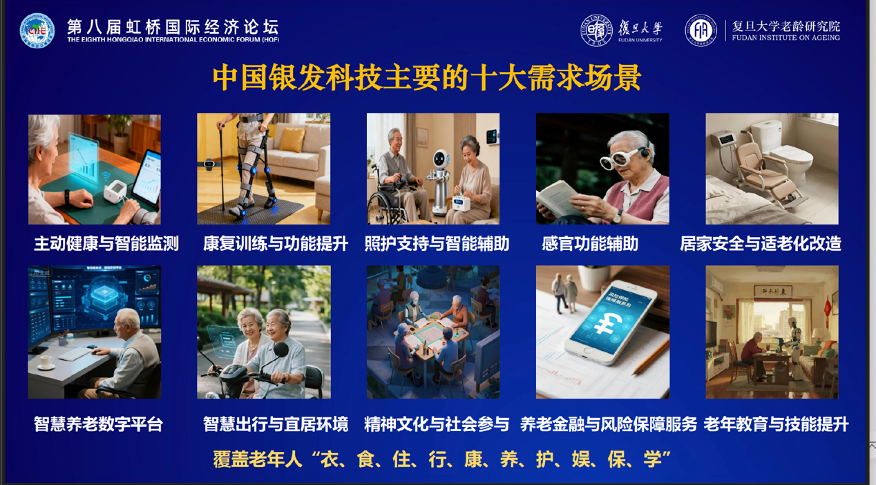 在此背景下,“银发科技”成为银发经济的重要支撑力量。2025年11月6日,复旦大学老龄研究院教授彭希哲在第八届虹桥国际经济论坛上发言,做《中国银发科技发展报告2025》。